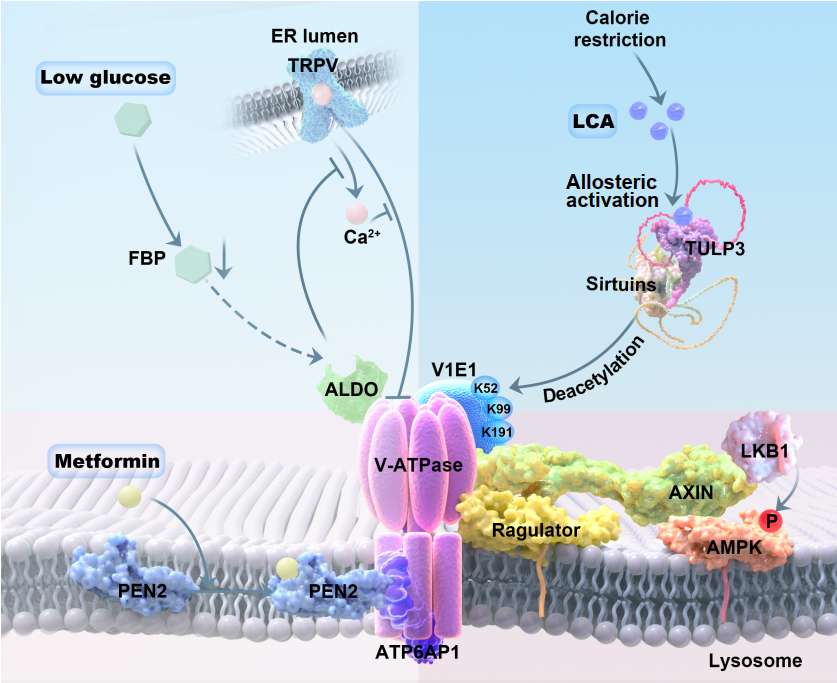 1.卡路里收敛(CR)升高的石胆酸与TULP3结合,激活sirtuins,进而去乙酰化溶酶体膜里的质子泵v-ATPase的V1E1亚基(作用于K52、K99和K191残基),由此扼制了v-ATPase。该历程促使AXIN/LKB1转位至溶酶体名义,由LKB1这一上游的激酶磷酸化并激活AMPK(右轴)。