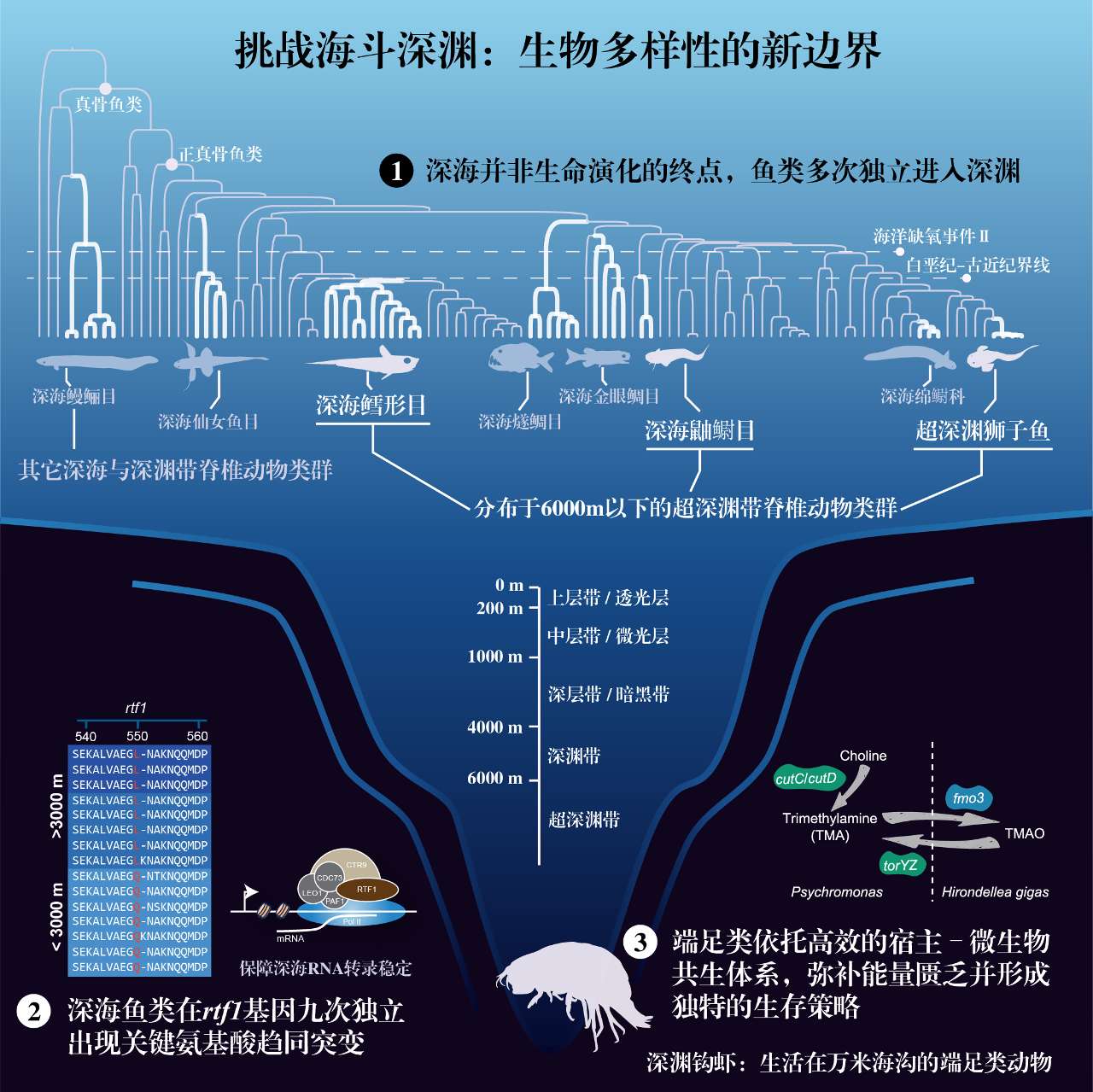 中科院水生生物讨论所何舜平、中科院深海科学与工程讨论所张海滨、徐涵,统一西北工业大学王堃和青岛华大基因讨论院范广益等团队,运用特等样本与多组学数据,从宏不雅到微不雅多维度解码了幽谷动物的“人命密码”。讨论初次系统重构了脊椎动物屡次孤立参预幽谷的演化道路图,揭示深海并非人命演化的“止境”,而是滋长屡次改进的要道高地。在此基础上,团队发现深海鱼类在分子层面通过rtf1基因发生趋同突变,从而精妙地搪塞顶点环境;同期揭示端足类动物通过构建高效的“宿主–微生物”共生体系,有用弥补能量输入不及,酿成私有的生活策略。该系列效果系统回复了“人命如安在顶点环境中演化与顺应”的首要科学问题,为意识地球人命极限、开发与运用深海生物资源以及工作国度首要海洋政策提供了要道科学贯通和进犯表面撑执。