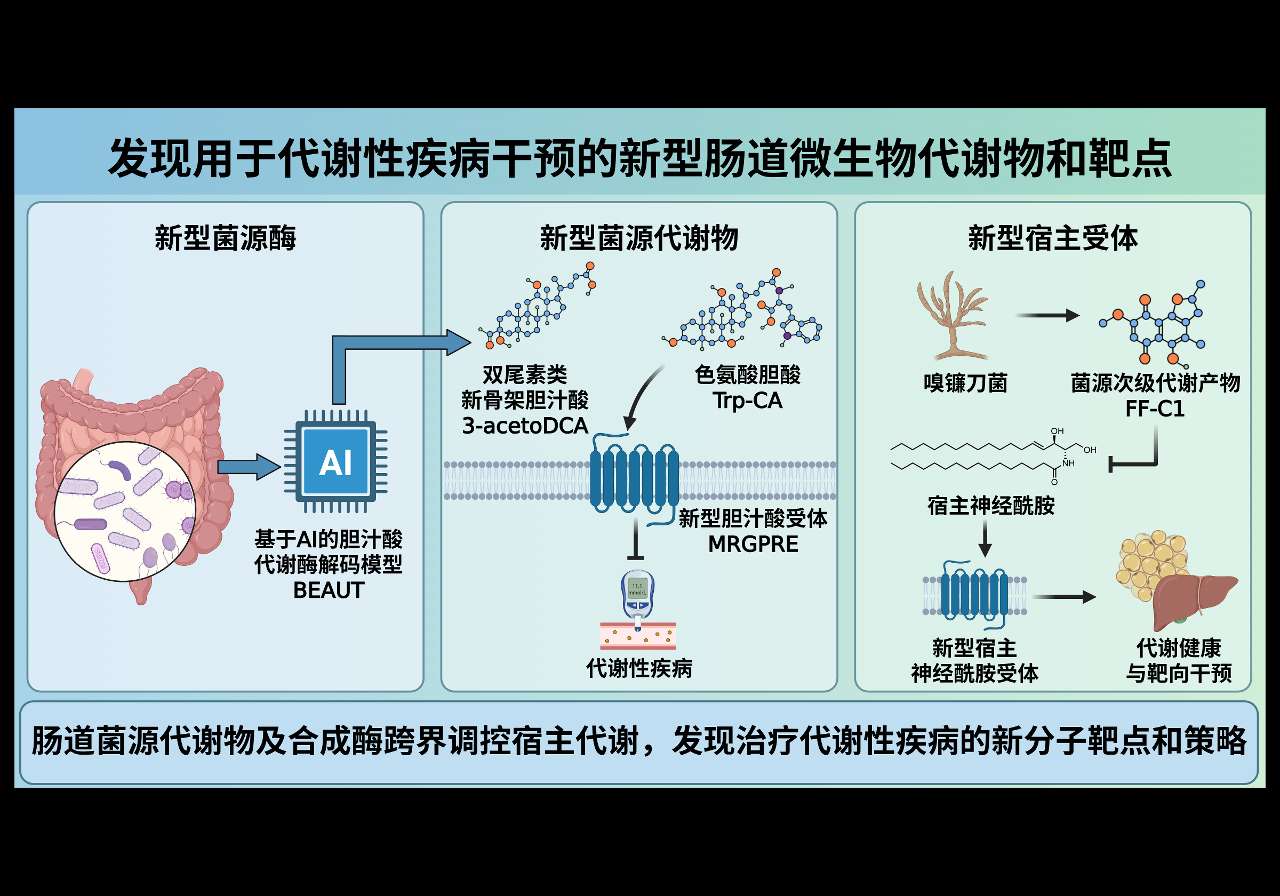 北京大学姜长涛、乔杰、孙金鹏、来鲁华、汪锴等团队相助,发现调控代谢性疾病的新式肠谈菌源代谢物、作用机制与搅扰策略:构建基于AI的菌源特异合成酶挖掘体系,发现并定名新骨架胆酸双尾素、色氨酸胆酸等新式菌源代谢物,揭示孤儿受体MRGPRE等新式胆汁酸受体,是代谢性疾病的新靶点;发现FF-C1等肠谈共生真菌新式次级代谢居品,理会其通过调控宿主神经酰胺改善代谢性疾病的作用,并发现神经酰胺新受体,开发靶向搅扰策略。